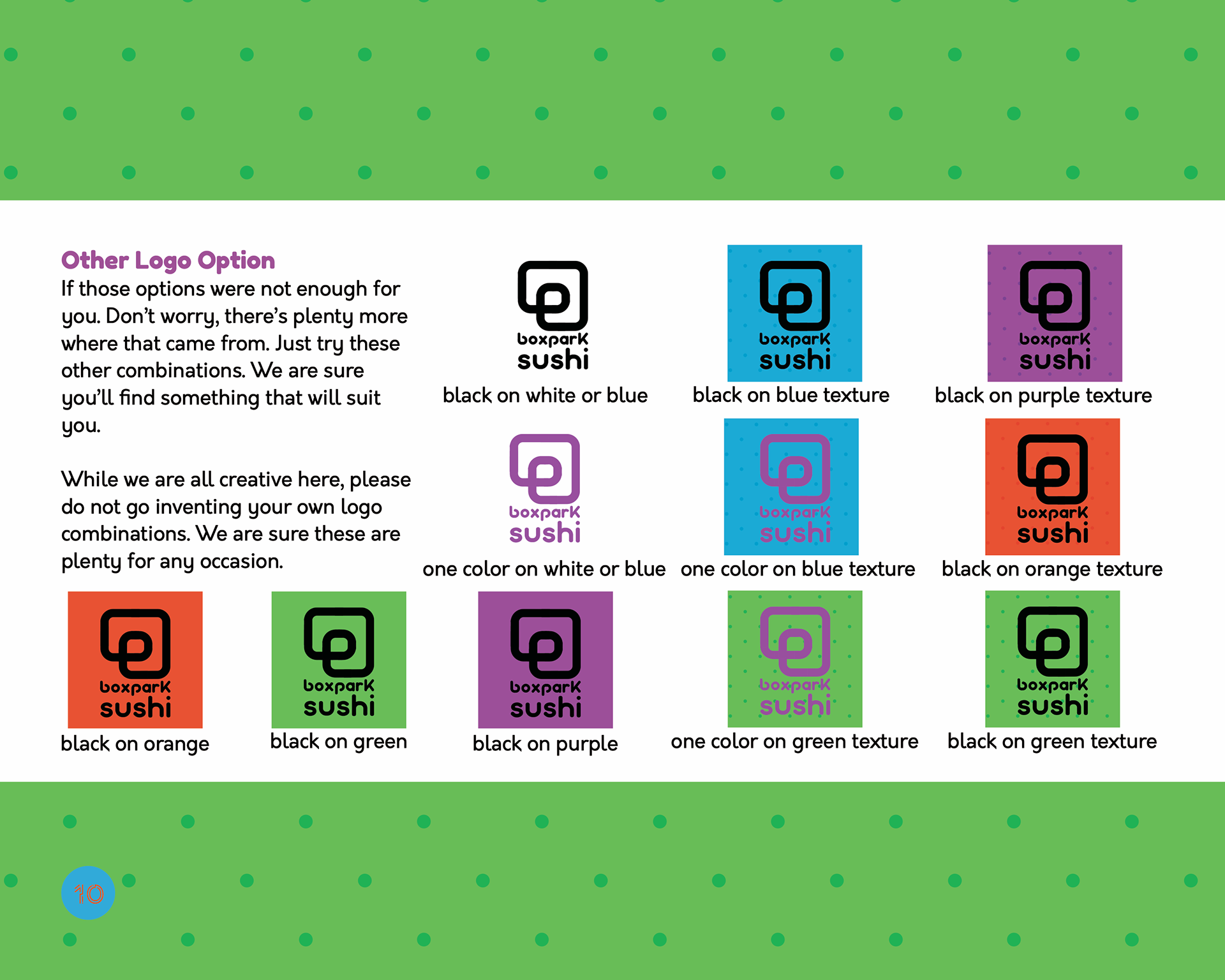 The Boxpark Sushi brand was developed to reflect the target audience's attributes. Boxpark Sushi's voice and tone is friendly, adventurous, and youthful. The brand's design expresses its attributes through the use of bright colors and polka dot patterns that create movement. The brand differentiates itself from the competition and expresses innovation by avoiding the use sushi restaurant trends, like the inclusion sushi related iconography within its logo, or the use of reds and blacks. Boxpark sushi not only portrays its product through imagery, but also portrays its audience. Boxpark sushi shows innovation by connecting with its audience first and its market second.